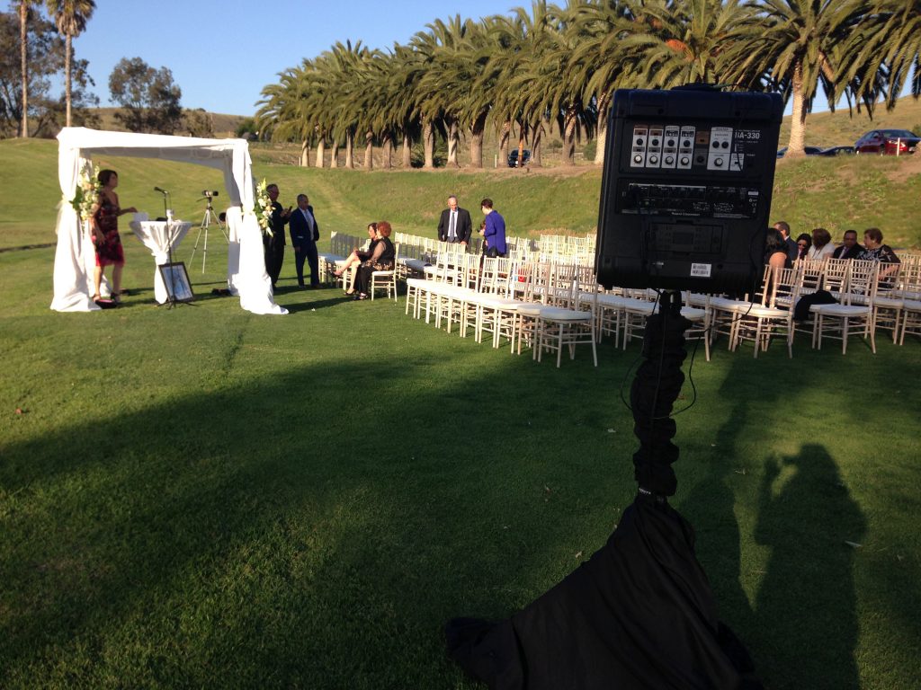 San Diego provides a beautiful day for Esmi and Mitch’s destination wedding. A battery powered speaker and microphone setup is perfect for this golf course ceremony.